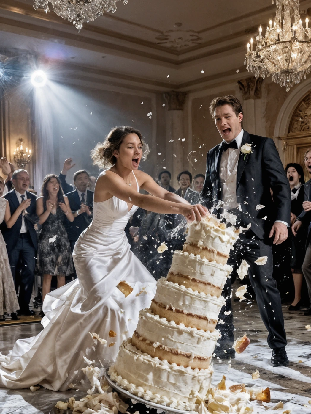 La struttura oscillò per un secondo infinito e poi collassò. Piatti, porcellana, pan di Spagna, crema, decorazioni dorate: tutto precipitò sul marmo con uno schianto tremendo. La glassa schizzò ovunque. Gli invitati urlarono. Il quartetto si fermò di colpo.